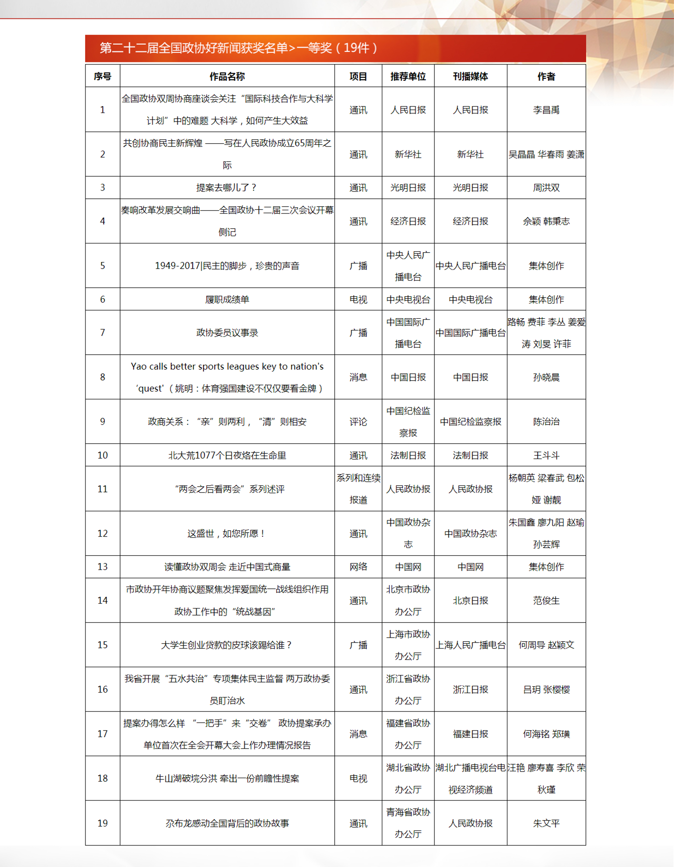 据悉,第二十二届全国政协好新闻评选工作共收到参评作品213件,其中26家中央新闻单位选送作品76件,31个省、自治区、直辖市政协办公厅选送作品137件。